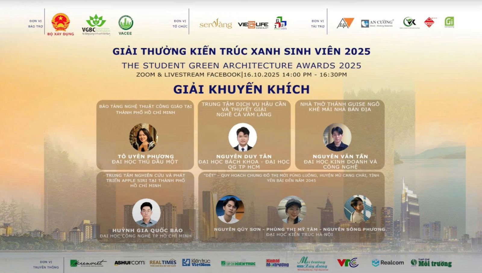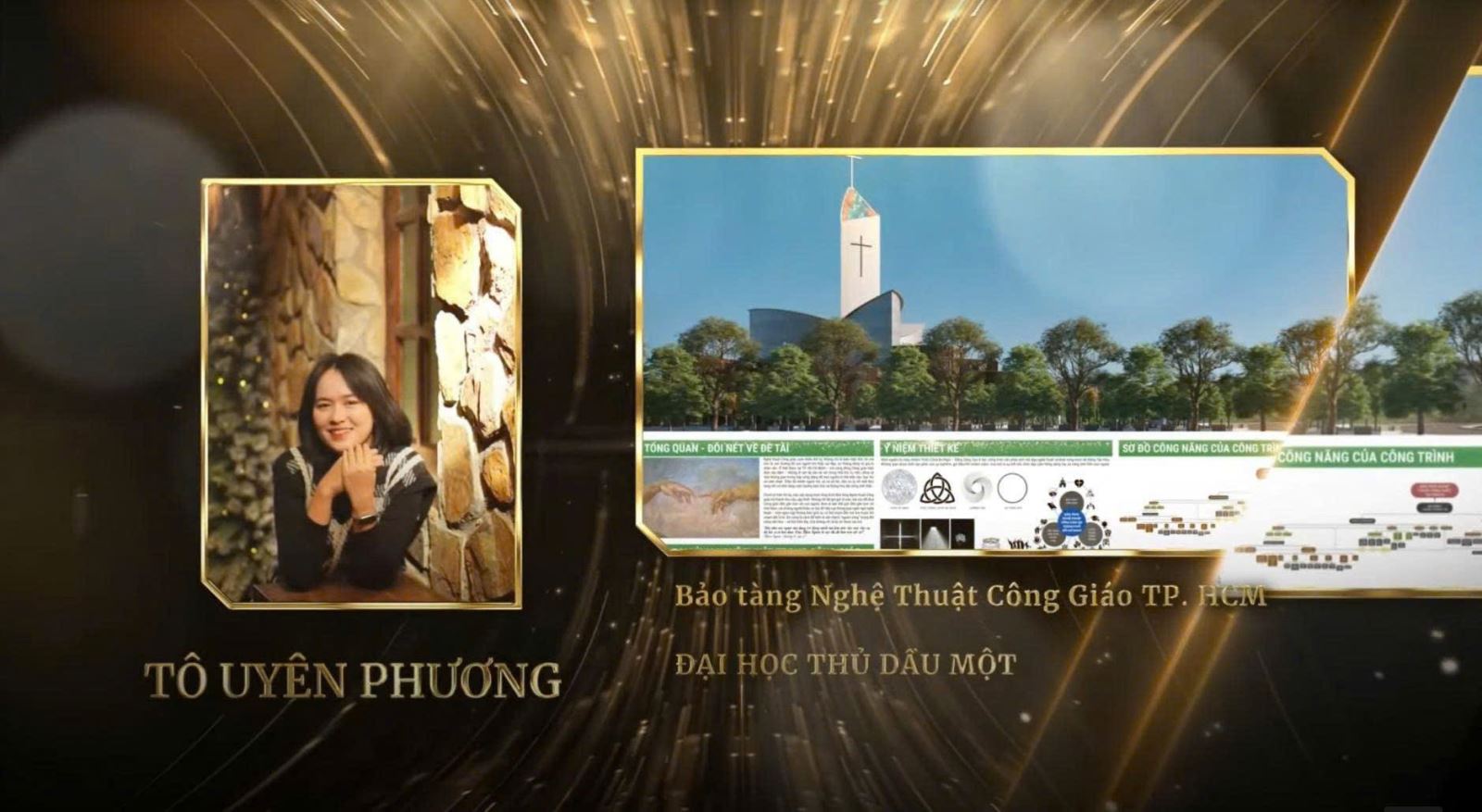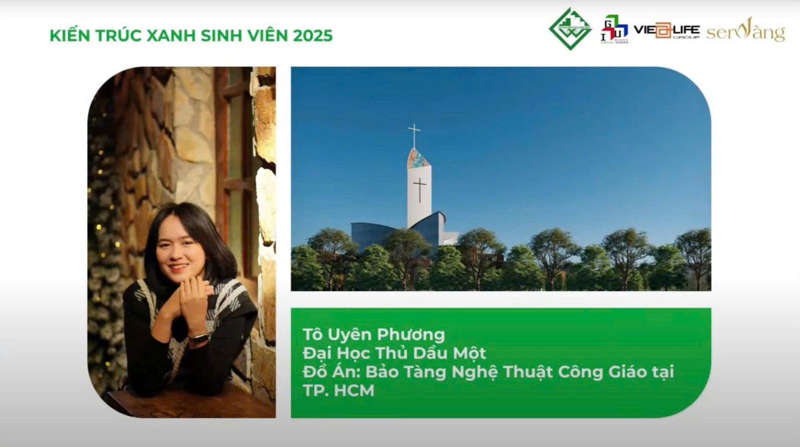 Giải thưởng năm 2025 thu hút gần 100 đồ án xuất sắc từ 15 trường đại học trên khắp cả nước; tại buổi Lễ công bố & trao Giải thưởng Kiến trúc Xanh Sinh viên 2025 vừa kết thúc. đề tài "BẢO TÀNG NGHỆ THUẬT CÔNG GIÁO:" của sinh viên Tô Uyên Phương dưới sự hướng dẫn của Ths. KTS Nguyễn Trần Tường Ly đã được trao Giải khuyến khích của cuộc thi. Một sự khích lệ và vinh dự cho chặn đường sắp đến của Uyên Phương, nữ sinh viên năng động, tài năng của ngành Kiến trúc, đại học Thử Dầu Một.